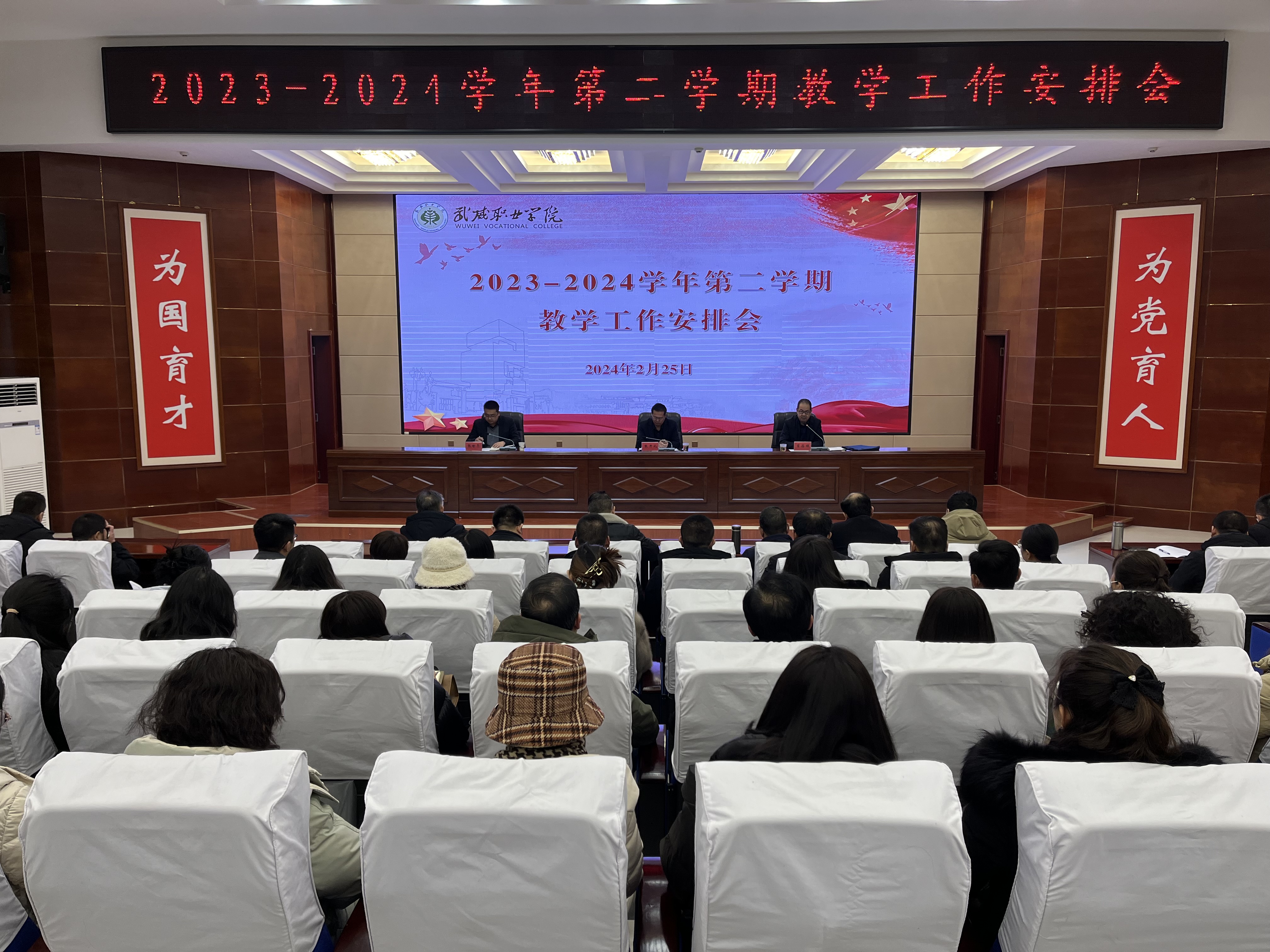 為持續(xù)推動(dòng)教學(xué)運(yùn)行與管理規(guī)范化、標(biāo)準(zhǔn)化、科學(xué)化,進(jìn)一步提升新學(xué)期教學(xué)工作成效和人才培養(yǎng)質(zhì)量,扎實(shí)推進(jìn)學(xué)校高質(zhì)量建設(shè),2月25日上午,學(xué)校在菁英廳組織召開了2023-2024學(xué)年第二學(xué)期教學(xué)工作安排會(huì)。學(xué)校校長、黨委副書記張開禮、黨委副書記翟存祥、各二級學(xué)院負(fù)責(zé)人、教學(xué)秘書、教研室主任、各專業(yè)帶頭人和教務(wù)處全體工作人員參加了會(huì)議。會(huì)議由翟存祥主持。