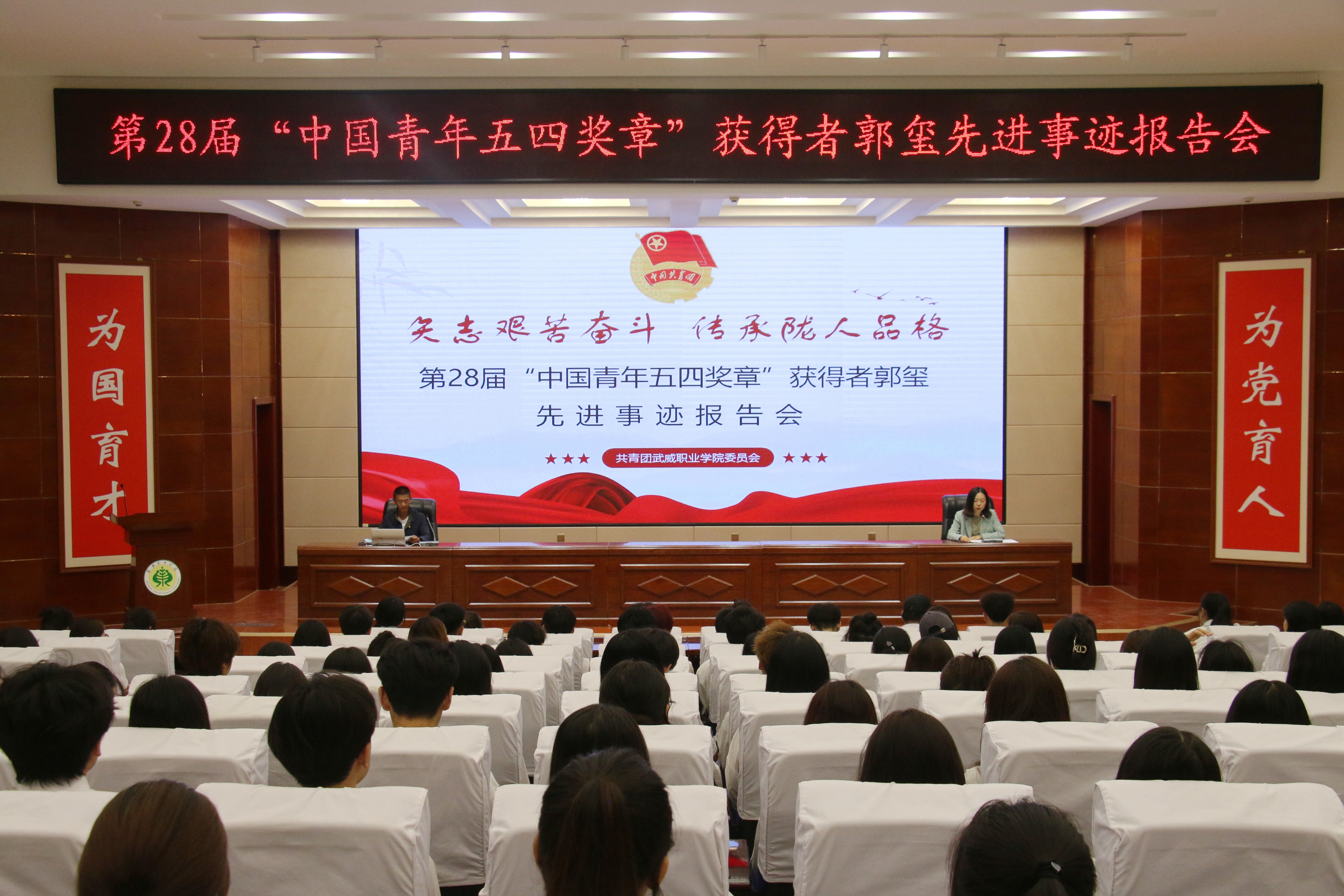 為進(jìn)一步引導(dǎo)和激勵(lì)團(tuán)員青年踔厲奮發(fā)、篤行不怠,厚植奮斗底色,5月24日,學(xué)校在菁英廳舉行“矢志艱苦奮斗傳承隴人品格”第28屆“中國(guó)青年五四獎(jiǎng)?wù)隆眰€(gè)人先進(jìn)事跡報(bào)告會(huì)。學(xué)校邀請(qǐng)第28屆“中國(guó)青年五四獎(jiǎng)?wù)隆鲍@得者——郭璽同志出席活動(dòng),并作了“三代青春鑄綠洲”主題宣講報(bào)告。學(xué)校“青馬工程”培訓(xùn)班學(xué)員、優(yōu)秀學(xué)生代表共計(jì)220余人參加報(bào)告會(huì)。會(huì)議由團(tuán)委副書(shū)記謝麗霞主持。