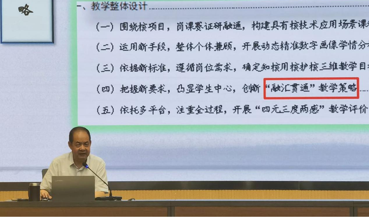 翟存祥以“獲獎作品是如何打磨的——以2023年核技術應用作品為例”為題,對標國家教學能力大賽標準,總結參賽經驗,對比賽中教學團隊的組建、參賽項目的選題、人才培養(yǎng)方案的完善、課程標準的制訂、教學實施方案和教案撰寫、課堂實錄視頻的拍攝以及賽場答辯的準備做了深入細致的分析。