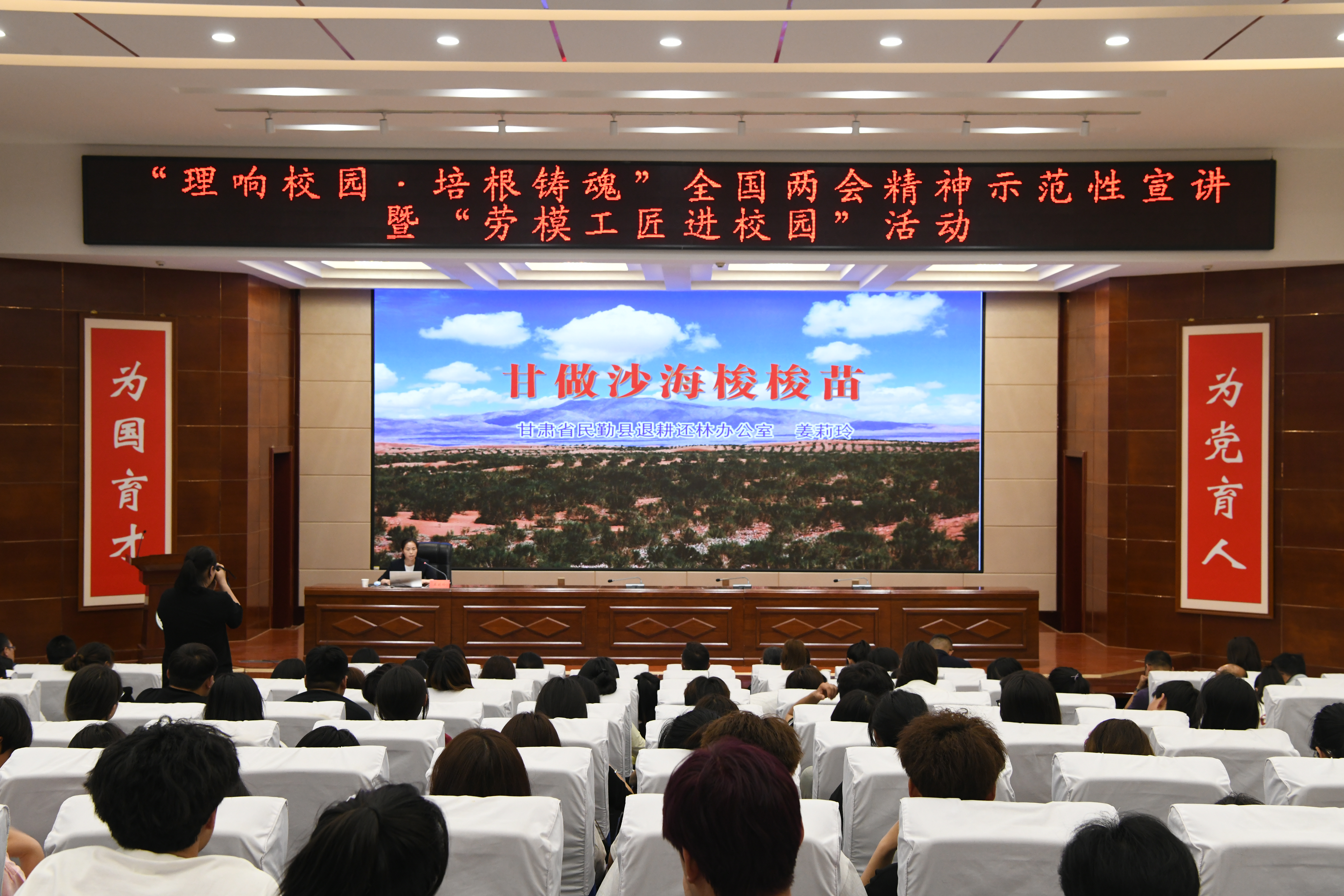為全面深入學習領會習近平總書記在全國兩會期間發(fā)表的一系列重要講話精神以及全國兩會審議通過的報告和文件精神,根據(jù)省委教育工委、省總工會有關要求,5月20日上午,甘肅省“理響校園·培根鑄魂”全國兩會精神示范性宣講暨“勞模工匠進校園”活動武威職業(yè)學院專場,在學校學生發(fā)展中心菁英廳舉行。學校邀請?zhí)m州理工大學馬克思主義學院教授王海霞,武威民勤退耕還林辦公室主任、甘肅省五一巾幗獎章獲得者姜莉玲,蘭州理工大學經管學院學生白玲玲來學校宣講。學校黨委委員、副校長何毅,宣傳統(tǒng)戰(zhàn)部負責人、師生代表共200余人參加宣講會。宣講會由何毅主持。