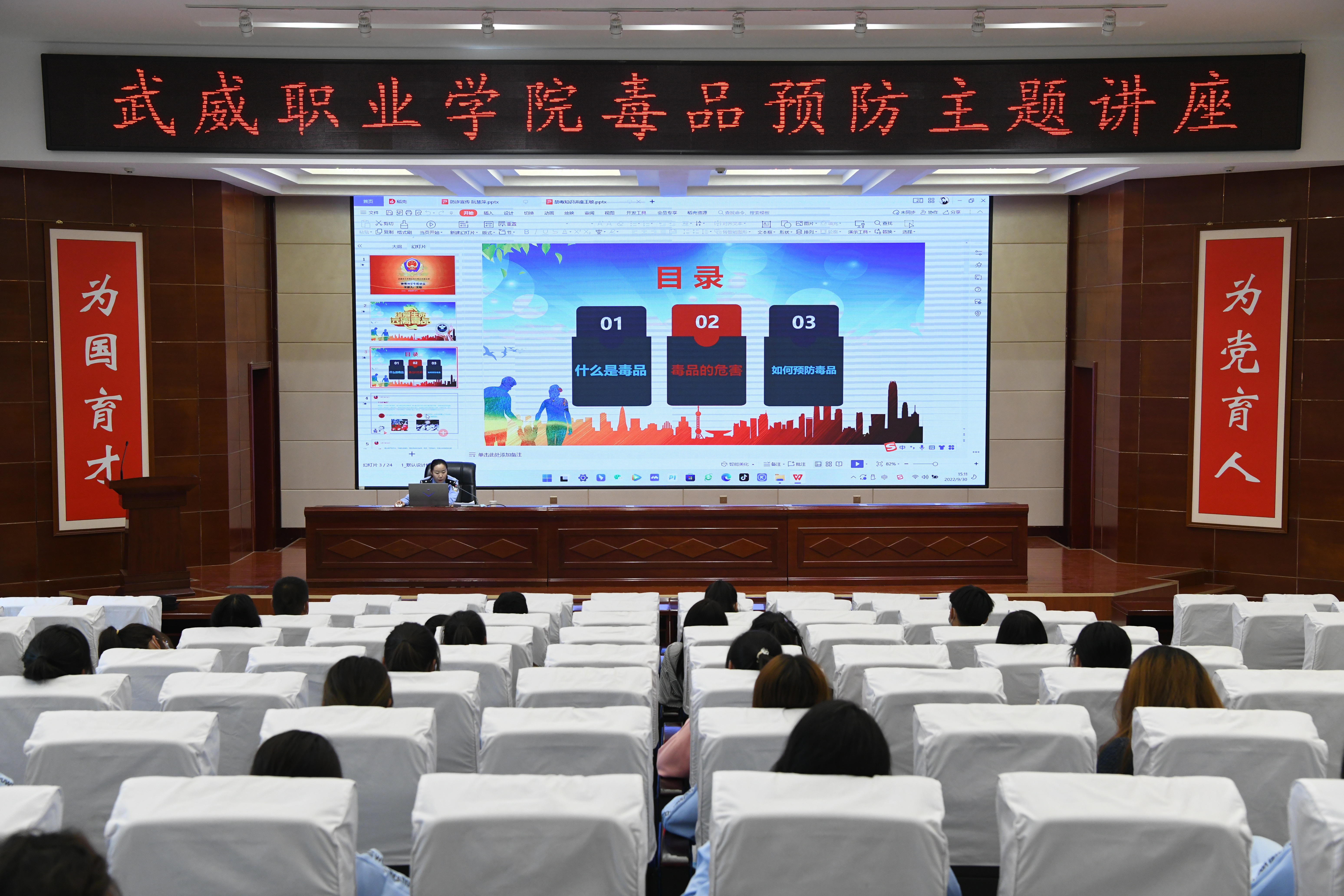 為進一步加強學(xué)校毒品預(yù)防教育工作,不斷提高師生識毒、防毒、拒毒意識,9月30日,學(xué)校安全保衛(wèi)處邀請武威市公安局涼州分局西關(guān)派出所民警王敏同志在學(xué)生發(fā)展中心菁英廳開展“健康人生 綠色無毒”預(yù)防毒品主題講座,各二級學(xué)院師生代表聆聽了講座,講座由安全保衛(wèi)處負責(zé)人李欣主持。