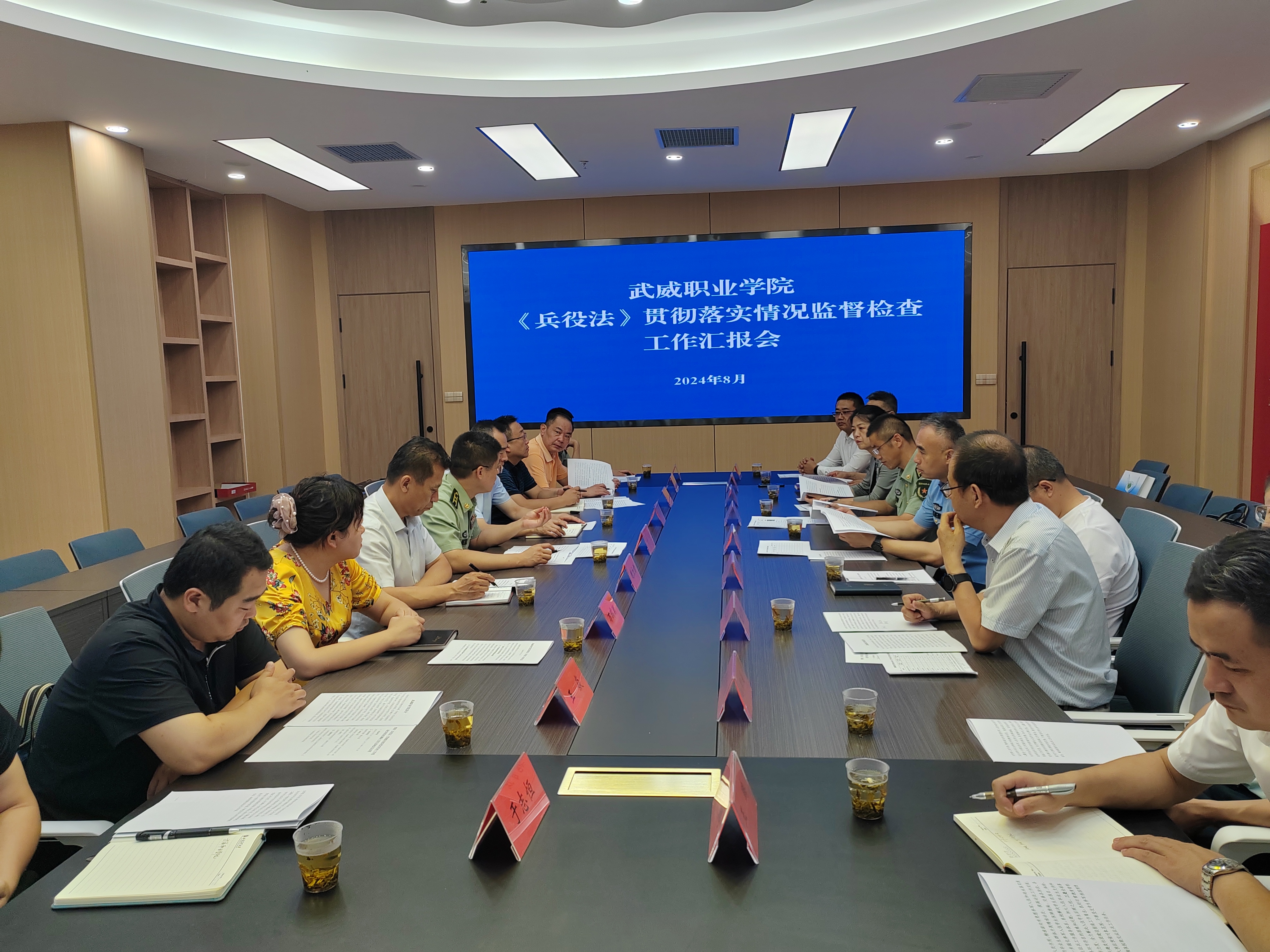 8月2日上午,省級(jí)《兵役法》貫徹落實(shí)情況監(jiān)督檢查工作組一行9人在甘肅省軍區(qū)動(dòng)員局征集處程龍?zhí)庨L(zhǎng)的帶領(lǐng)下,在武威軍分區(qū)大校副司令員吳沖、武威市司法局副局長(zhǎng)黨萬馳和武威市教育局副局長(zhǎng)馬曉麗的陪同下,來我校調(diào)研《兵役法》貫徹落實(shí)情況。學(xué)校黨委書記王宏,黨委副書記翟存祥,黨委委員、副校長(zhǎng)王永緒陪同調(diào)研。