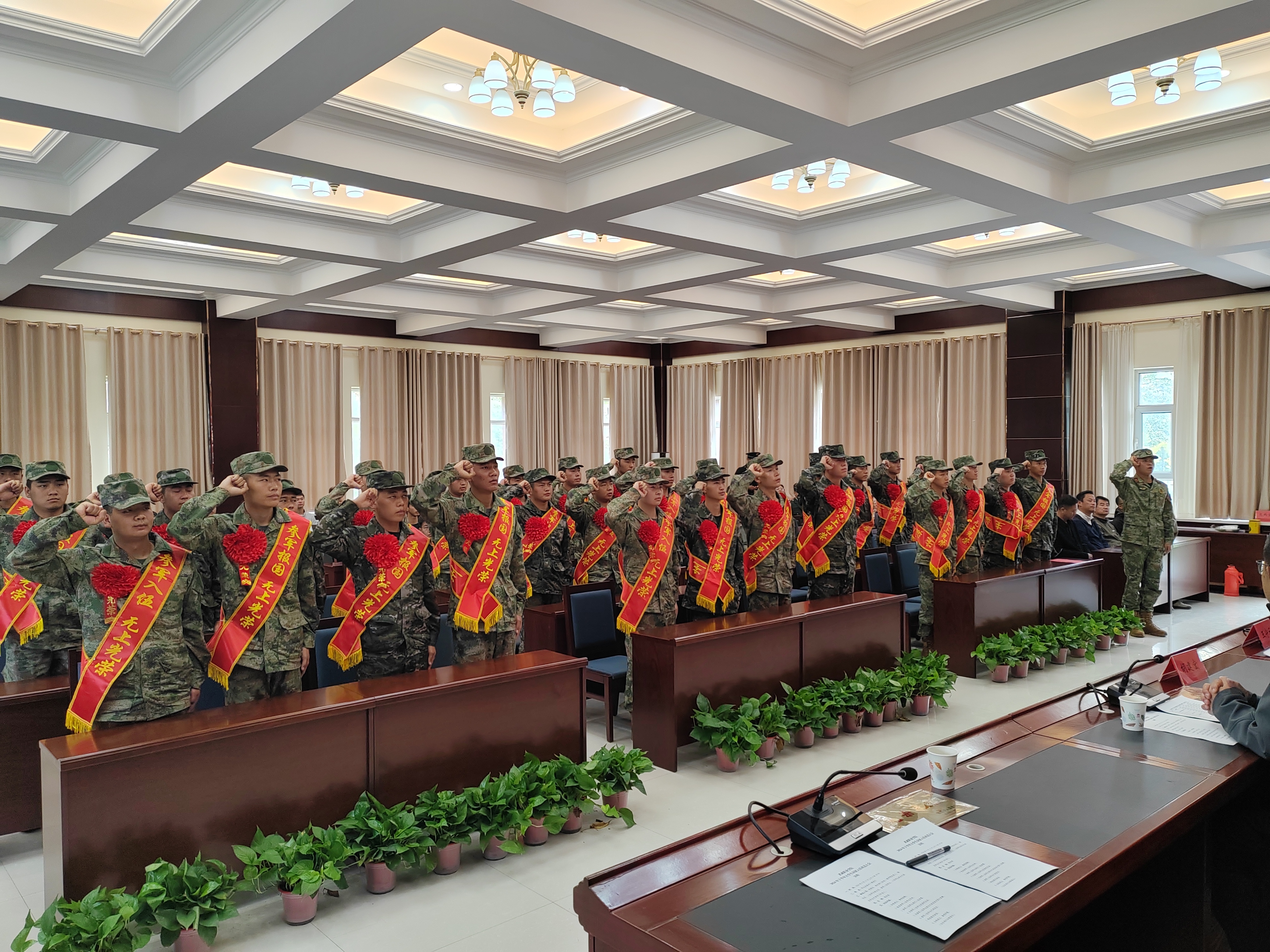 歡送大會(huì)上,入伍學(xué)生在退伍復(fù)學(xué)大學(xué)生代表的帶領(lǐng)下進(jìn)行了鏗鏘有力的入伍宣誓,參會(huì)領(lǐng)導(dǎo)向?qū)W校所在地入伍的30名新兵佩戴大紅花并贈(zèng)送紀(jì)念品,為入伍學(xué)生家長(zhǎng)代表頒發(fā)“光榮之家”光榮牌。