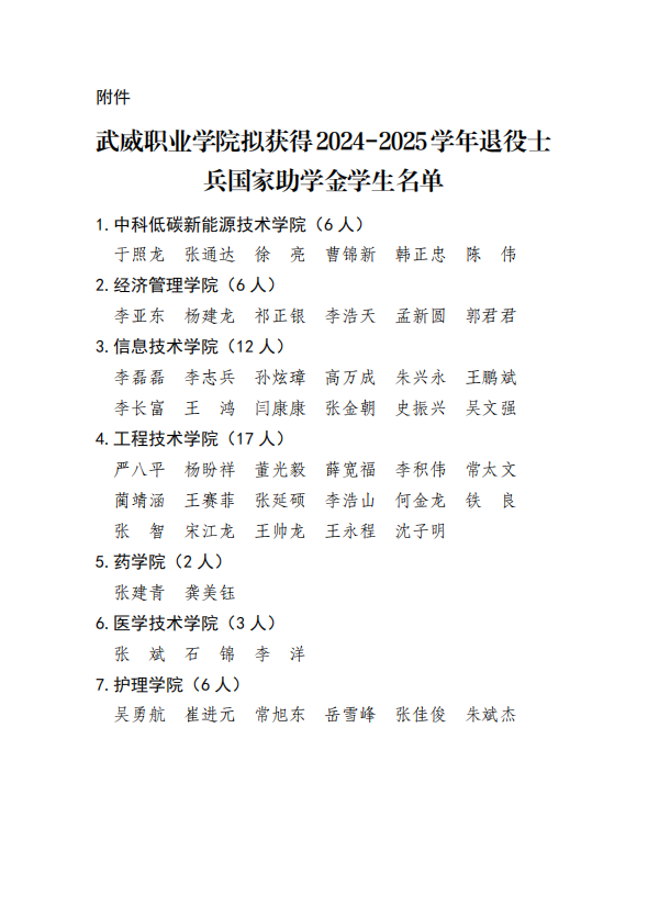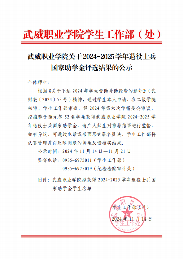 2024-2025學(xué)年武威職業(yè)學(xué)院退役士兵國家助學(xué)金公示