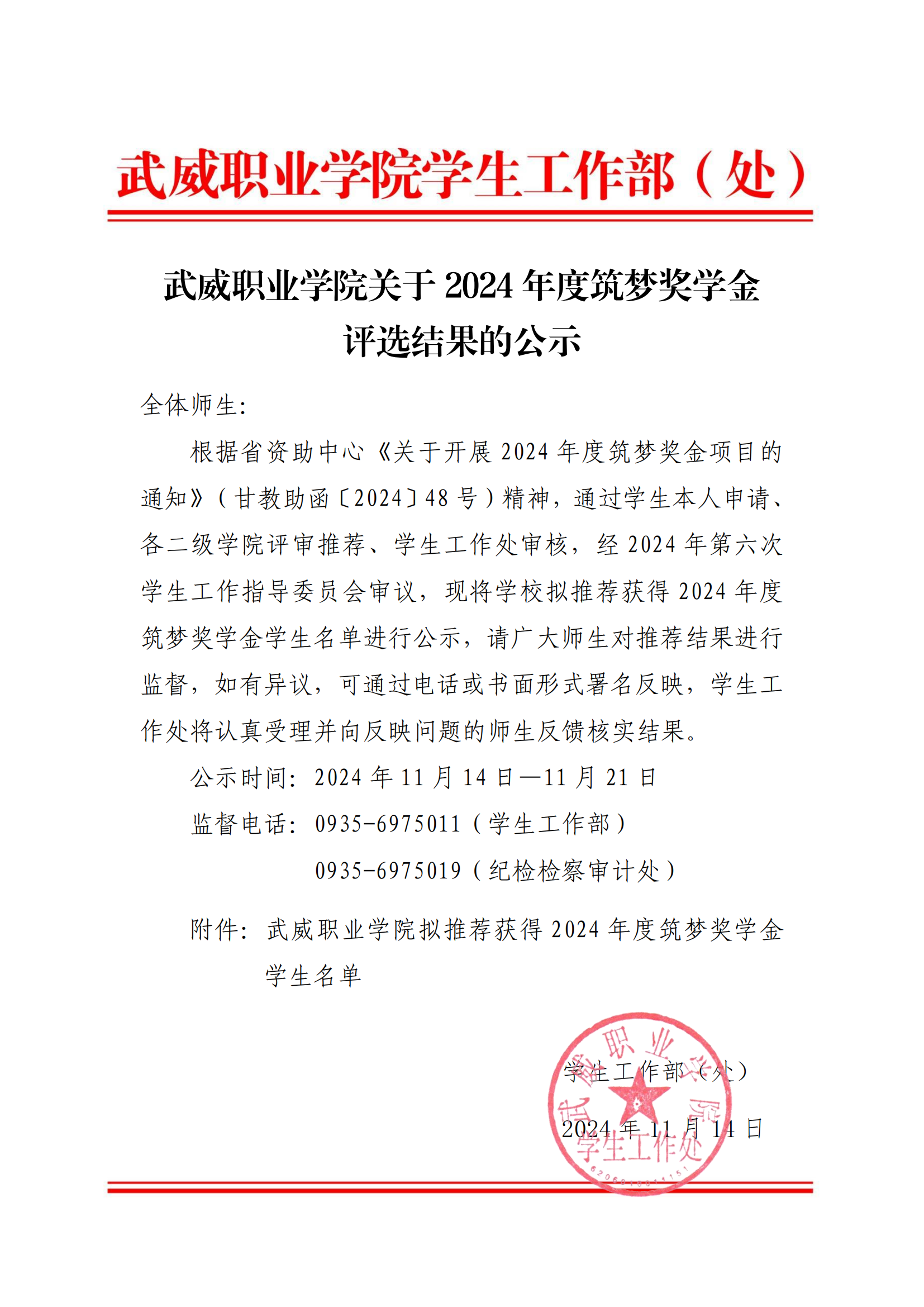 武威職業(yè)學(xué)院關(guān)于2024-2025學(xué)年國(guó)家助學(xué)金評(píng)選結(jié)果的公示