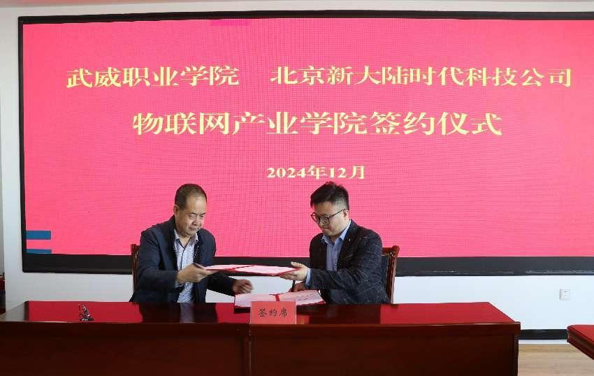 樊斌和翟存祥簽署《武威職業(yè)學(xué)院 北京新大陸時(shí)代科技公司產(chǎn)教融合合作協(xié)議》。