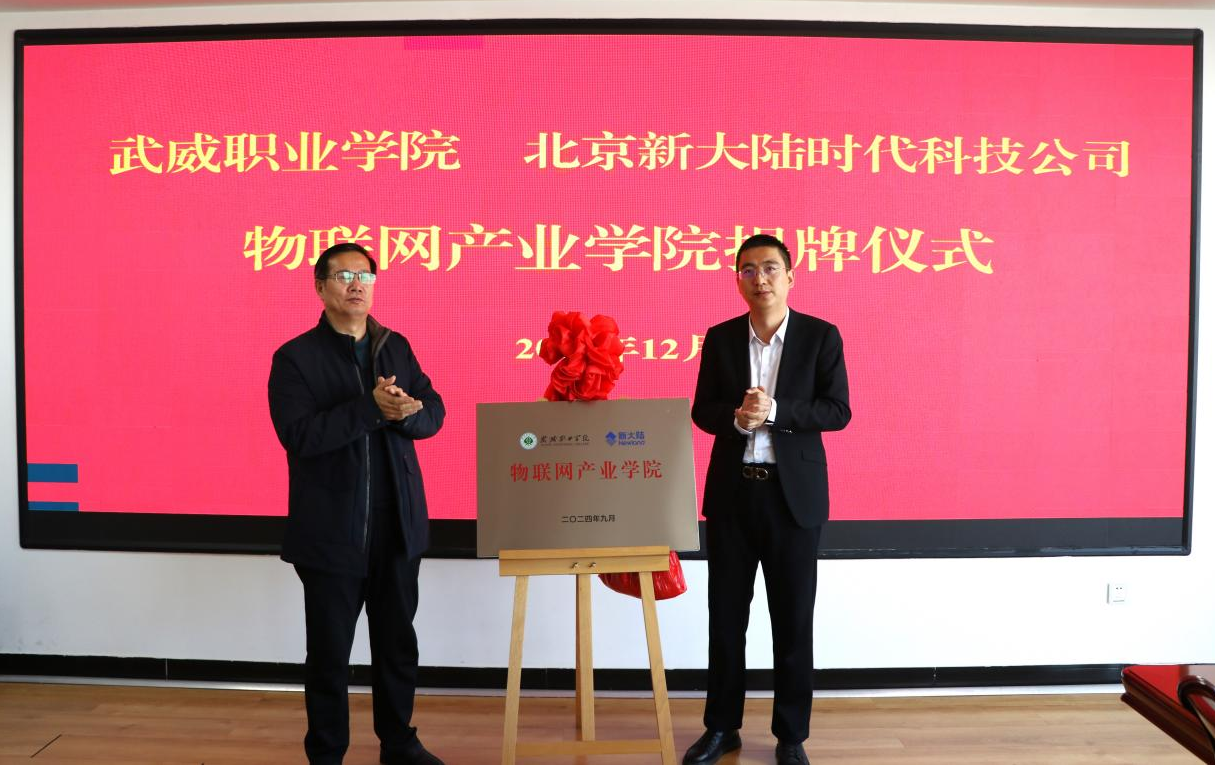 為全面深化產(chǎn)教融合,加強(qiáng)校企合作,進(jìn)一步提高我校人才培養(yǎng)質(zhì)量。12月3日,學(xué)校在能源科技樓811會(huì)議室舉行武威職業(yè)學(xué)院和北京新大陸時(shí)代科技公司物聯(lián)網(wǎng)產(chǎn)業(yè)學(xué)院簽約暨揭牌儀式。北京新大陸時(shí)代科技公司西北區(qū)總監(jiān)劉寧、技術(shù)總監(jiān)樊斌,相關(guān)業(yè)務(wù)部門負(fù)責(zé)人,學(xué)校校長、黨委副書記張開禮、黨委副書記翟存祥、相關(guān)部門負(fù)責(zé)人及教師代表參加活動(dòng)。黨委委員、副校長王永緒主持儀式。