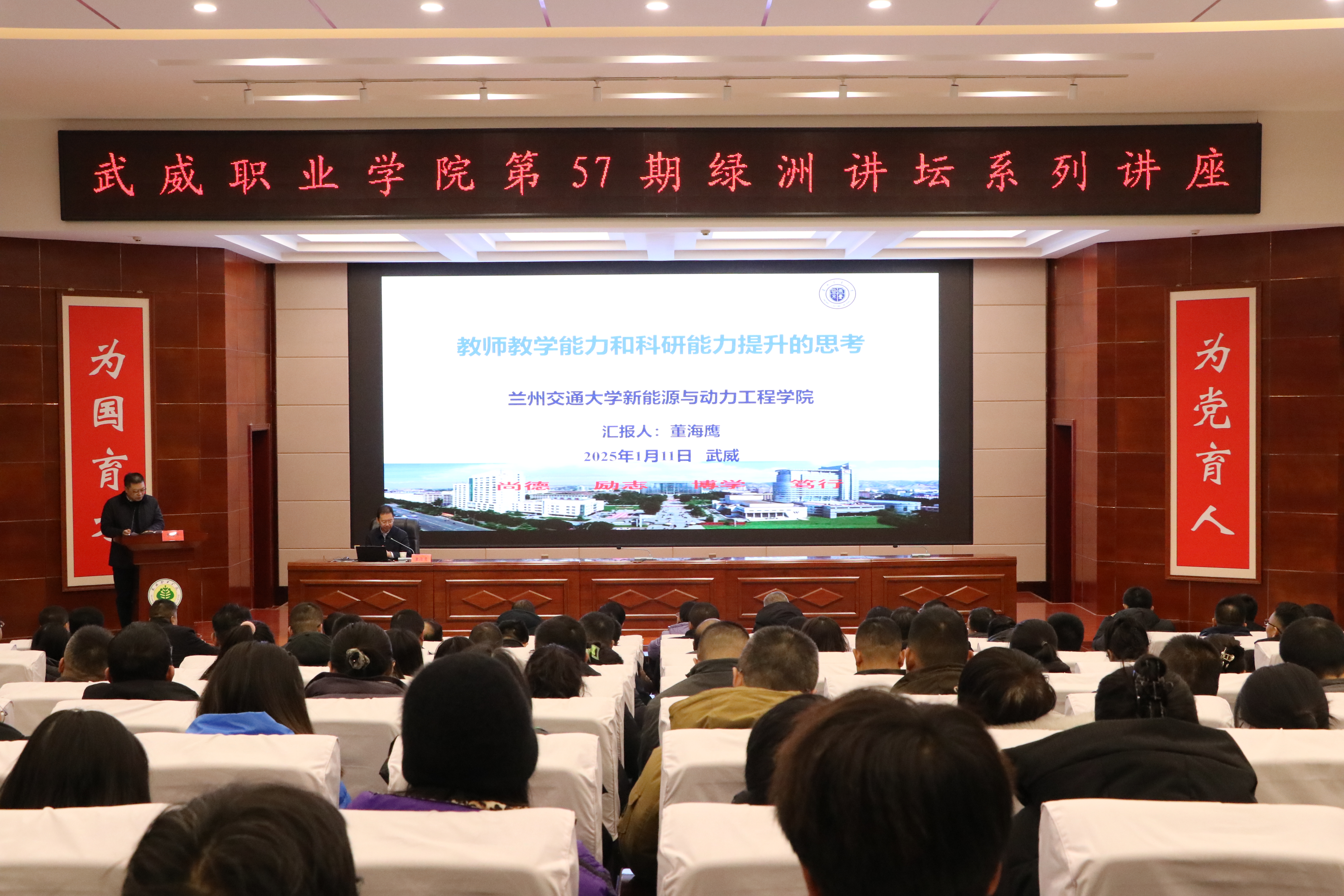 1月11日上午,學(xué)校特邀蘭州交通大學(xué)博士生導(dǎo)師董海鷹教授在菁英廳作了“教師教學(xué)能力和科研能力提升的思考”主題講座。講座由學(xué)校校長李海軍主持,學(xué)校領(lǐng)導(dǎo)、中層管理干部、教研室主任及教師代表共210余人參加。