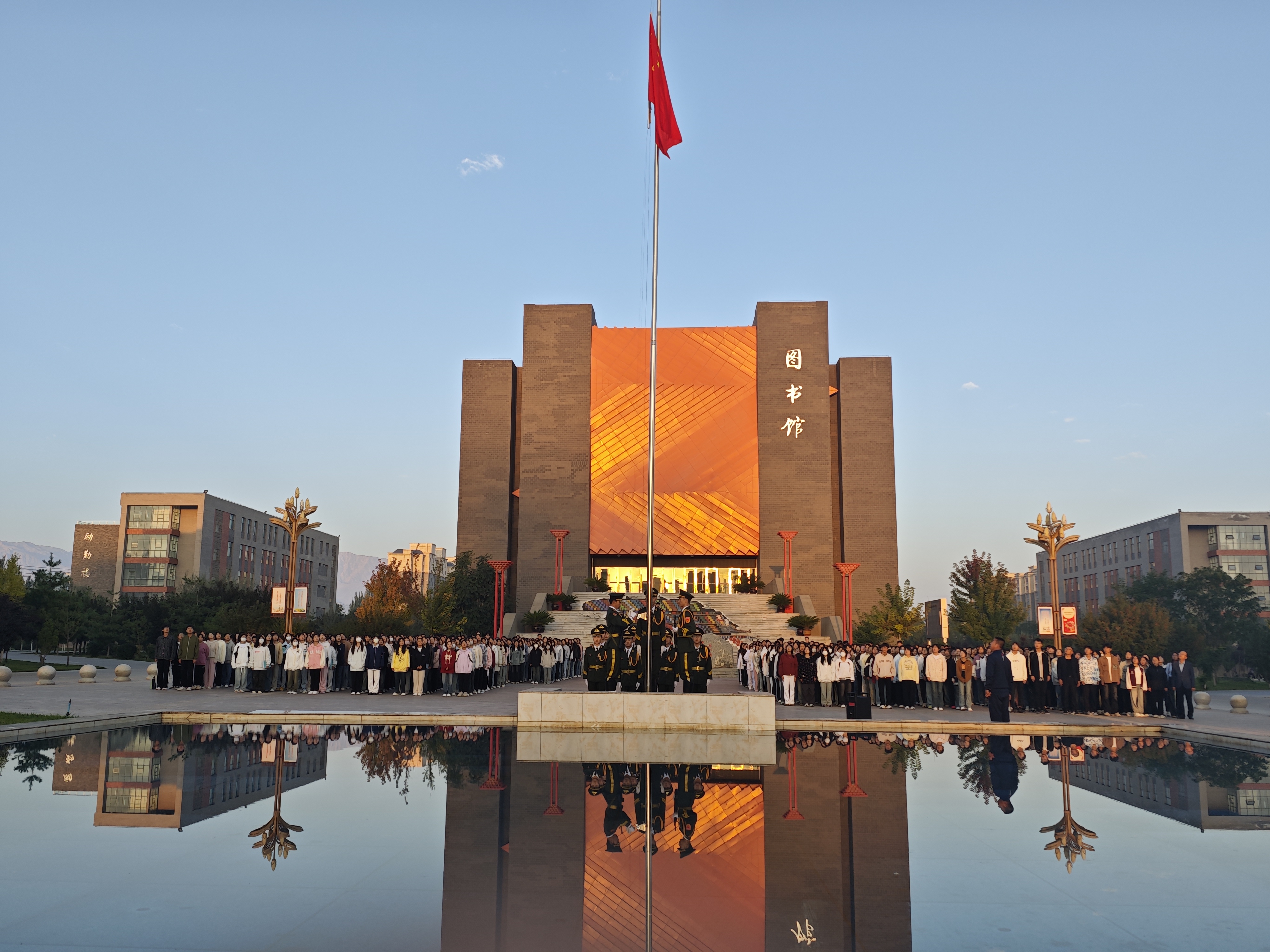 七點十五分,升國旗儀式正式開始。在全體師生的注視下,國旗護衛(wèi)隊邁著整齊的步伐護送五星紅旗進場,伴隨著莊嚴的《義勇軍進行曲》,五星紅旗冉冉升起。全體師生肅穆而立,行注目禮,齊唱國歌。