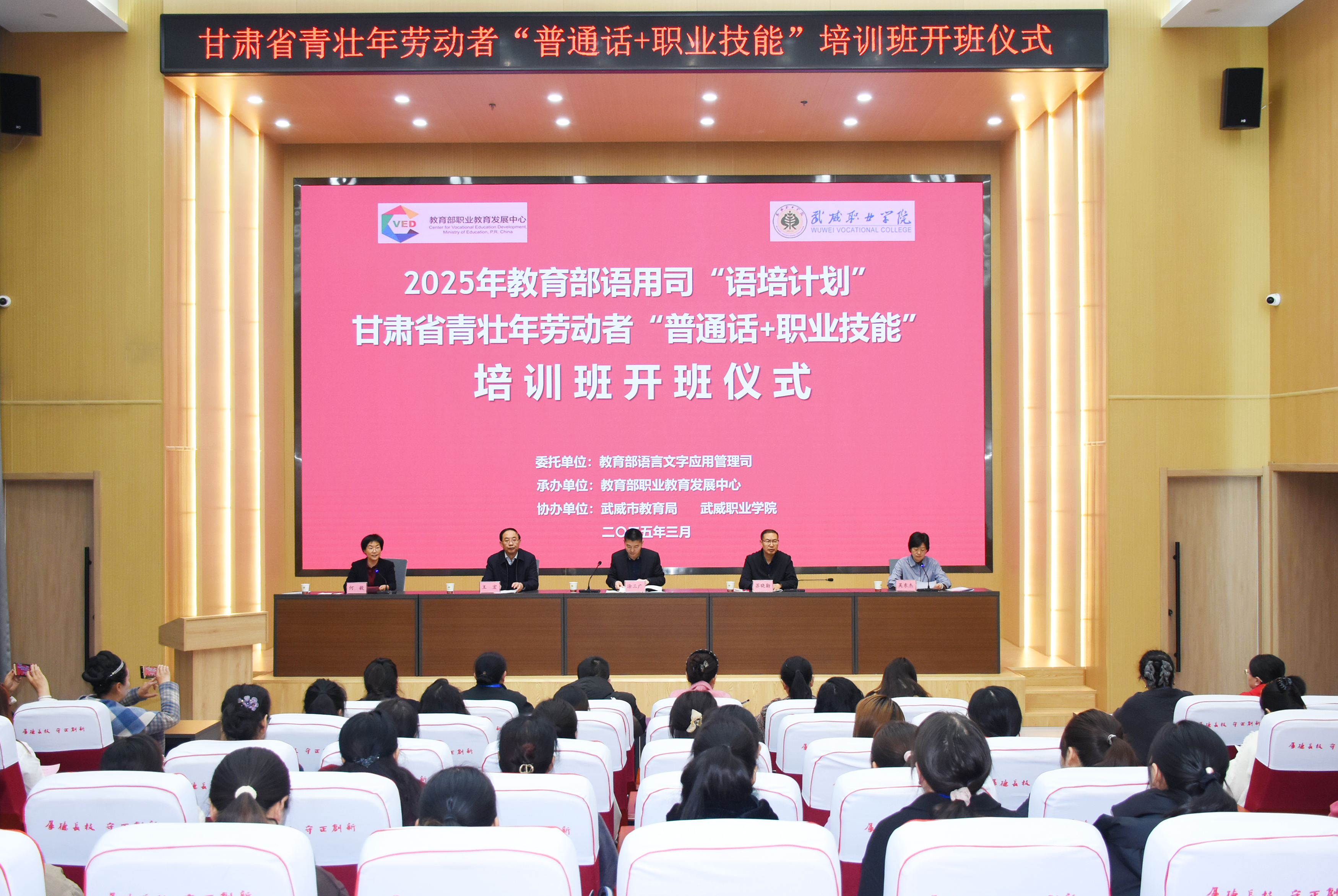 3月25日,教育部語用司“語培計劃”甘肅省青壯年勞動者“普通話+職業(yè)技能”培訓(xùn)班在學(xué)校成功開班。本次培訓(xùn)由教育部語用司主辦,教育部職業(yè)教育發(fā)展中心承辦,武威市教育局和學(xué)校協(xié)辦。本次培訓(xùn)是深入貫徹落實黨的二十大和二十屆二中、三中全會精神,落實全國教育大會精神,實施《教育強國建設(shè)規(guī)劃綱要(2024-2035年)》的重要舉措,旨在進一步推廣國家通用語言文字的應(yīng)用,促進鑄牢中華民族共同體意識。
