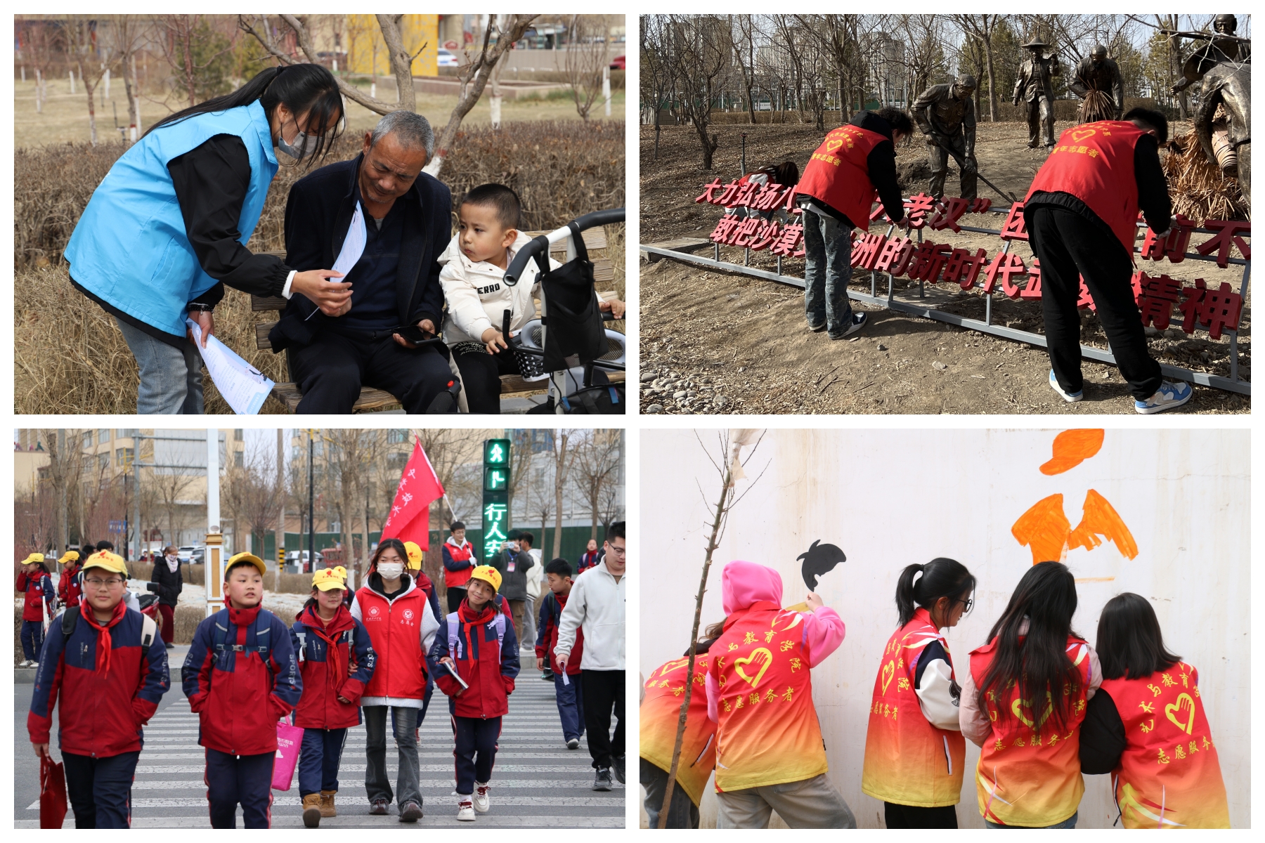 開展青春社區(qū)志愿服務(wù)活動。3月4日,護(hù)理學(xué)院組織15名志愿者前往西關(guān)街社區(qū)開展“保護(hù)環(huán)境,建設(shè)美麗社區(qū)”志愿服務(wù)活動,活動中志愿者們手持清潔工具,鏟除墻面小廣告,倡導(dǎo)綠色環(huán)保生活理念,引導(dǎo)市民共同守護(hù)美好家園。3月9日,現(xiàn)代農(nóng)業(yè)學(xué)院組織志愿者前往海藏公園開展“公園環(huán)保行動派”志愿服務(wù)活動,清理雜草雜物,向過往群眾宣傳垃圾分類知識。3月6日,中科低碳新能源技術(shù)學(xué)院志愿者在學(xué)校周邊十字路口開展文明交通勸導(dǎo)活動,向行人普及交通安全知識、提醒遵守交通信號燈,向騎行者強(qiáng)調(diào)佩戴安全頭盔、不逆行、不闖紅燈的重要性,組成護(hù)學(xué)小分隊引導(dǎo)周邊小學(xué)的同學(xué)有序通過馬路等。3月29日,藝術(shù)與教育學(xué)院學(xué)前教育專業(yè)20余名志愿者前往富鑫源社區(qū)化身“社區(qū)美育師”,與甘肅十二元素傳媒有限公司設(shè)計師共同完成了“鄰里和諧”主題墻繪。