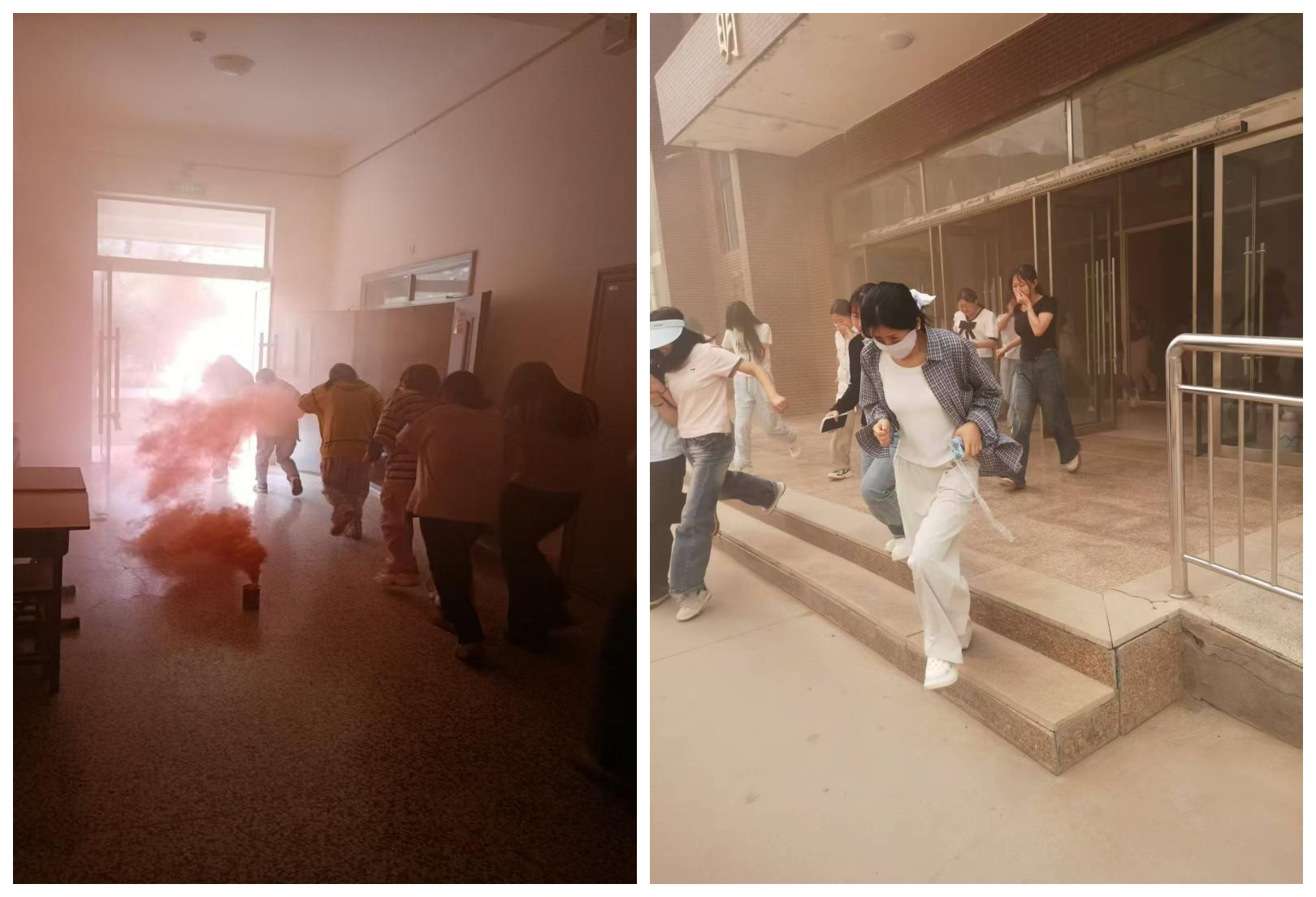下午4點30分,隨著警報響起,演練正式拉開帷幕。安保人員迅速點燃預(yù)先放置在各樓宇內(nèi)的煙霧彈,一瞬間樓宇內(nèi)濃煙彌漫,同學(xué)們迅速捂住口鼻、彎腰低姿從消防疏散通道,有序地向安全區(qū)域疏散撤離。演練過程中,同學(xué)們沉著冷靜,動作迅速規(guī)范,僅用短短幾分鐘時間便全部安全疏散到校園廣場等開闊地帶。