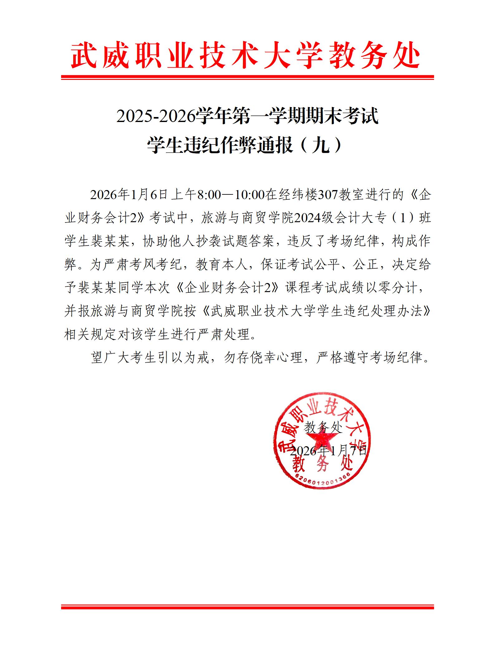 2025-2026學(xué)年第一學(xué)期期末考試學(xué)生違紀(jì)作弊通報(九)