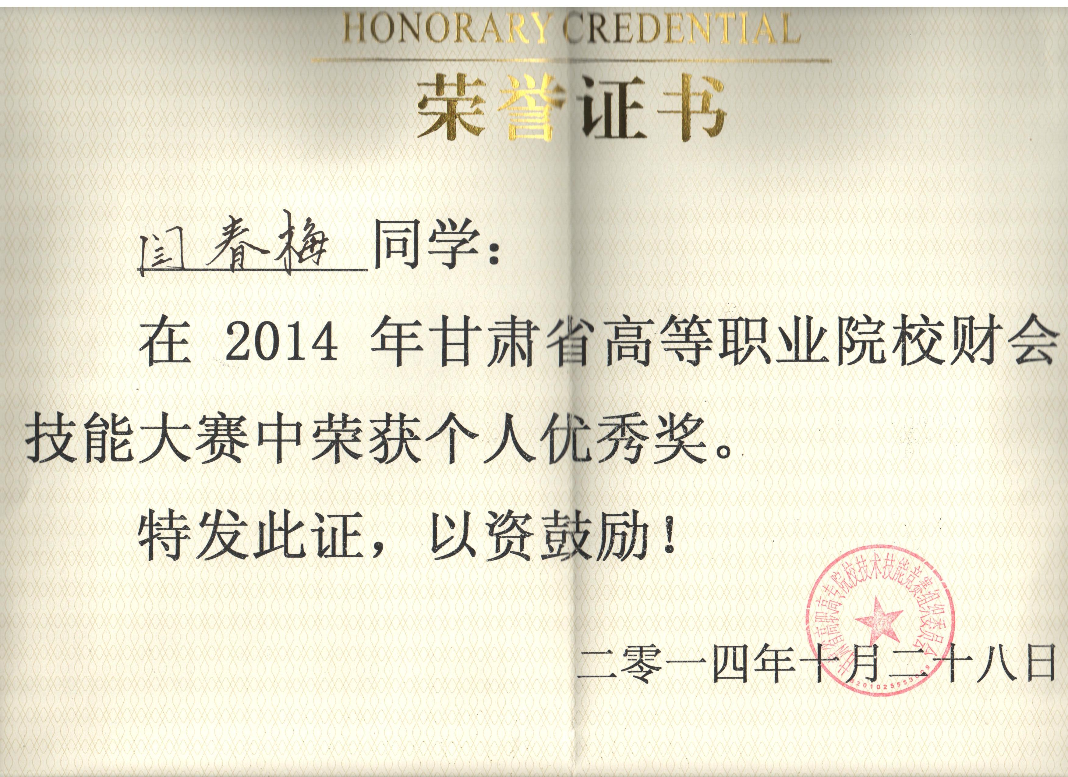 經(jīng)濟(jì)管理系李惠蘭、賀德赟老師指導(dǎo)我系會計專業(yè)學(xué)生參加2014年甘肅省高等職業(yè)學(xué)院財會技能大賽,榮獲優(yōu)秀獎。