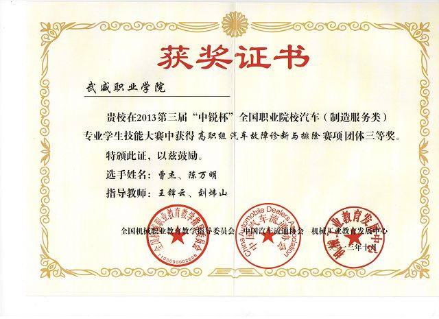 學(xué)院自接到《關(guān)于舉辦第三屆“中銳杯”全國職業(yè)院校汽車(制造服務(wù)類)專業(yè)學(xué)生技能大賽的通知》之后,學(xué)院領(lǐng)導(dǎo)對本次比賽高度重視,汽車工程系全體老師及學(xué)生對本次比賽更是充滿信心,汽車工程系專門召開了系部會(huì)議,組織討論了本次比賽的參賽方案,并確定了實(shí)訓(xùn)內(nèi)容、時(shí)間、地點(diǎn)和指導(dǎo)老師。經(jīng)過了各班推選、測試選拔、預(yù)賽、培訓(xùn)等環(huán)節(jié),最終決定由11級汽車檢測與維修中銳班陳萬明和曹杰兩位同學(xué)參加本次大賽。本次技能大賽分預(yù)選賽和決賽兩個(gè)賽程,預(yù)選賽采用遠(yuǎn)程視頻預(yù)選,經(jīng)過遠(yuǎn)程視頻預(yù)選賽的層層考核和選拔,我院參賽隊(duì)順利進(jìn)入決賽名單。10月12日汽車工程系王鐸云和劉煒山兩位老師帶領(lǐng)參賽隊(duì),赴江西南昌參加決賽。在決賽中,經(jīng)過激烈角逐,我院兩位參賽選手在全國36支高職組隊(duì)伍中脫穎而出,獲得了團(tuán)體三等獎(jiǎng)的優(yōu)異成績。