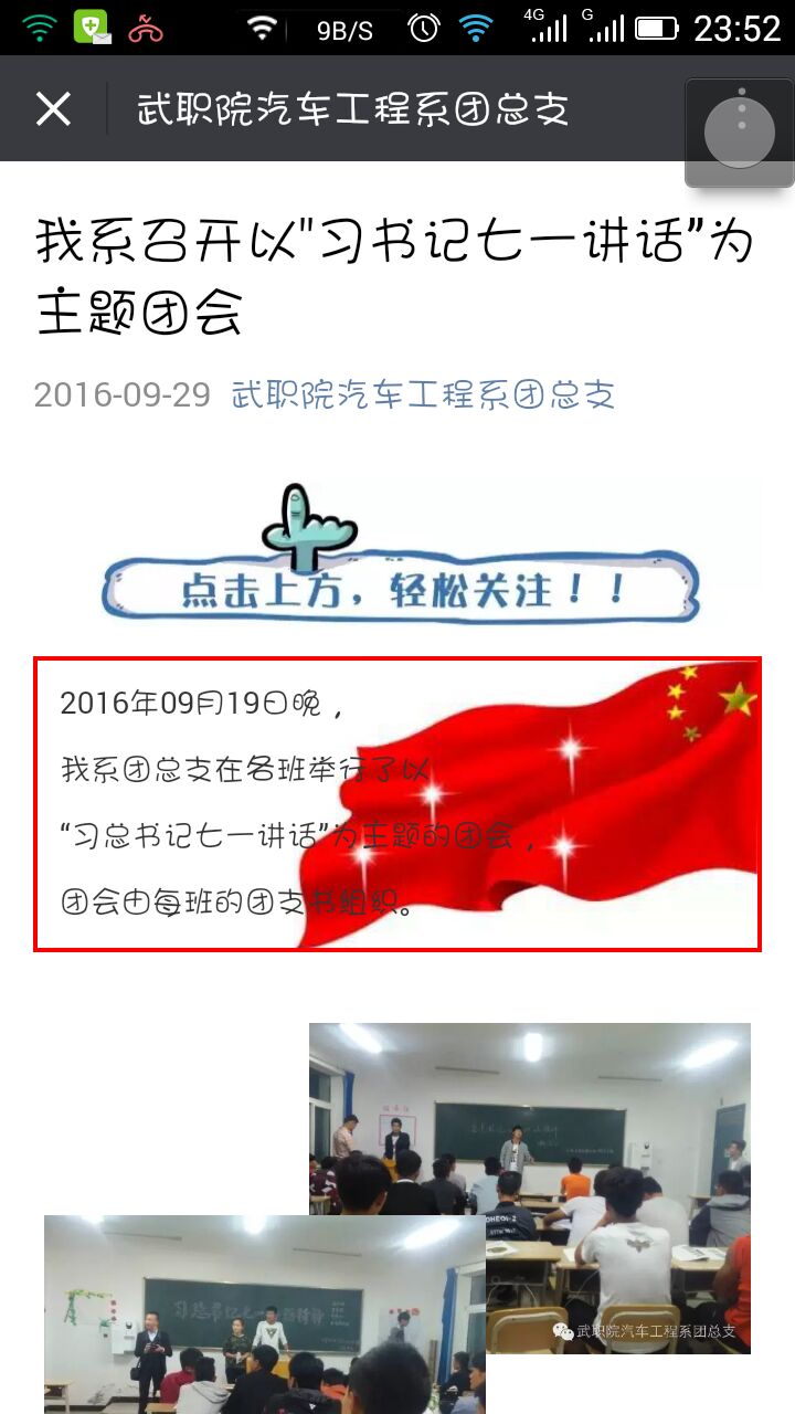 為深入推進(jìn)我系各級(jí)團(tuán)組織、團(tuán)干部和團(tuán)員青年學(xué)習(xí)習(xí)近平總書(shū)記“七一”重要講話精神,根據(jù)院團(tuán)委統(tǒng)一安排,汽車工程系團(tuán)總支于9月下旬在各班以主題團(tuán)會(huì)、座談會(huì)、黑板報(bào)等形式展開(kāi)學(xué)習(xí)討論,并在系微信、微博公眾平臺(tái)上進(jìn)行了宣傳教育。