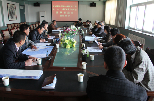 2013年3月27日上午,在二號教學(xué)樓會議室召開9、10、11號學(xué)生公寓樓圖紙答疑會。設(shè)計單位清華大學(xué)建筑設(shè)計研究院,施工投標(biāo)單位甘肅省第三建筑公司,甘肅省第四建筑公司,武威高壩建筑公司以及學(xué)院相關(guān)人員參加了會議。會議由副院長趙明主持。