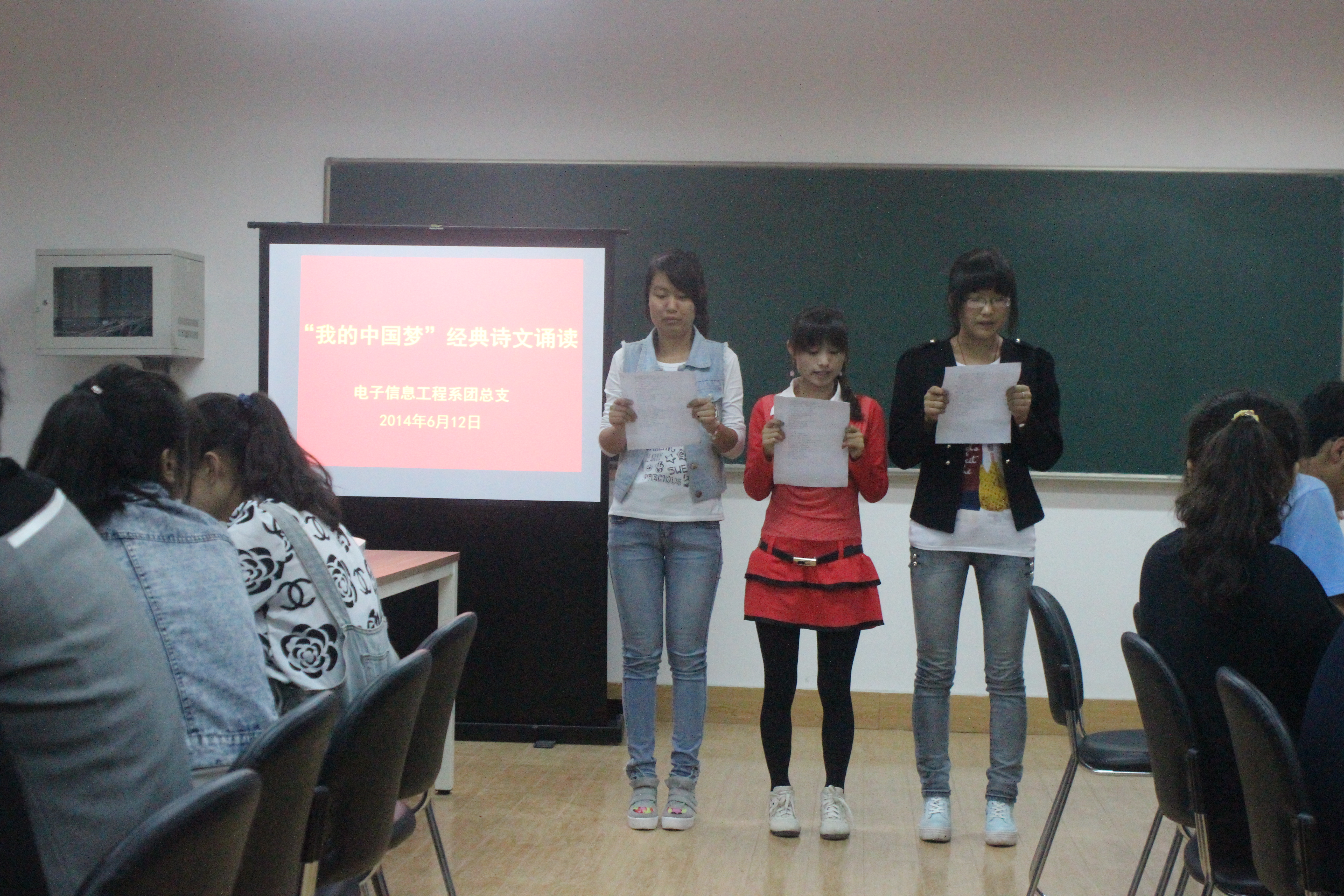 為進(jìn)一步培育和弘揚(yáng)社會(huì)主義核心價(jià)值觀,讓學(xué)生在經(jīng)典誦讀中觸摸中國(guó)傳統(tǒng)文化,增強(qiáng)愛國(guó)主義情懷,提升學(xué)生的文化底蘊(yùn)和人文素養(yǎng),深入開展中國(guó)特色社會(huì)主義宣傳教育,教育和引導(dǎo)大學(xué)生樹立正確的理想信念,努力為實(shí)現(xiàn)國(guó)家富強(qiáng)、民族復(fù)興、人民幸福的偉大“中國(guó)夢(mèng)”而努力。電子信息工程系團(tuán)總支于6月12日晚在MIDP移動(dòng)互聯(lián)網(wǎng)學(xué)院教研室舉辦“我的中國(guó)夢(mèng)”經(jīng)典愛國(guó)詩(shī)文誦讀活動(dòng)。