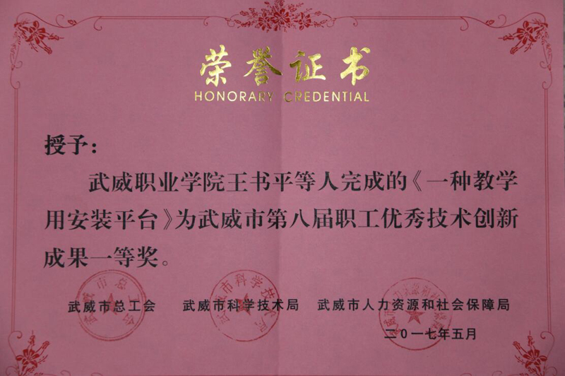 為貫徹落實武威市委、市政府關(guān)于《武威市十萬職工職業(yè)技能素質(zhì)提升活動工作方案(2016-2020年)》(武政辦發(fā)〔2016〕72號)文件精神,推動我市“雙創(chuàng)”工作的深入開展,激發(fā)我市廣大企事業(yè)職工提升技能和開拓創(chuàng)新的熱情。近日,由市總工會、市人社局、市科技局等單位聯(lián)合舉辦了“武威市第八屆職工技術(shù)創(chuàng)新成果評選活動”。本屆職工技術(shù)創(chuàng)新成果評選共征集創(chuàng)新成果87項,其中:學院推薦了十項研究課題、專利技術(shù)項目,王書平團隊《一種教學用安裝平臺》項目成果榮獲一等獎,申賓德團隊《簡易焊工考試用帶坡口鋼板火焰切割下料機的研究與應(yīng)用》,王勝團隊《“胰美舒”治療2型糖尿病周圍神經(jīng)病變(氣陰兩虛兼瘀證)的臨床觀察》項目成果榮獲三等獎。