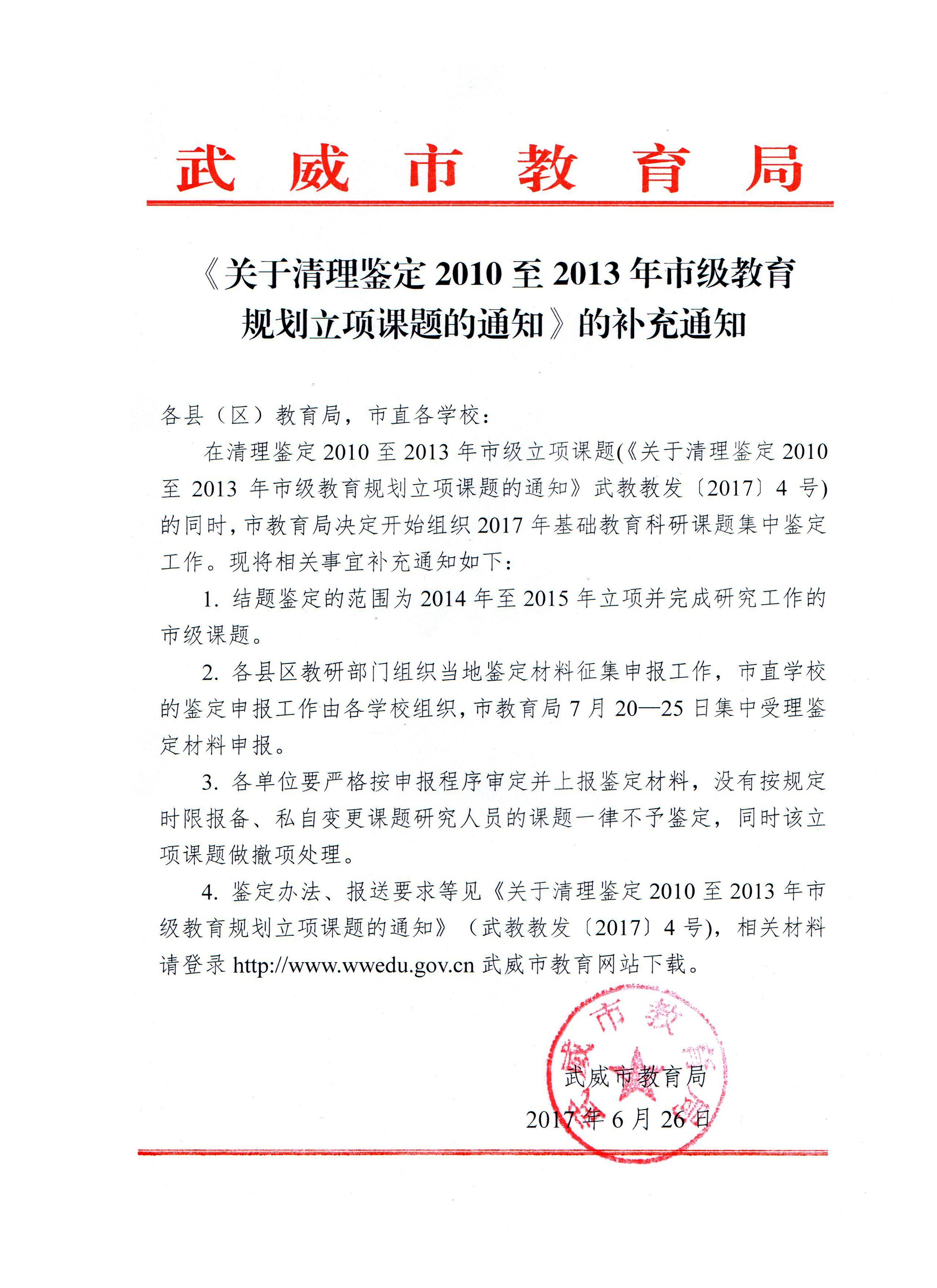 轉(zhuǎn)發(fā)武威市教育局《關(guān)于清理鑒定2010至2013年市級規(guī)劃立項課題的通知》的補(bǔ)充通知