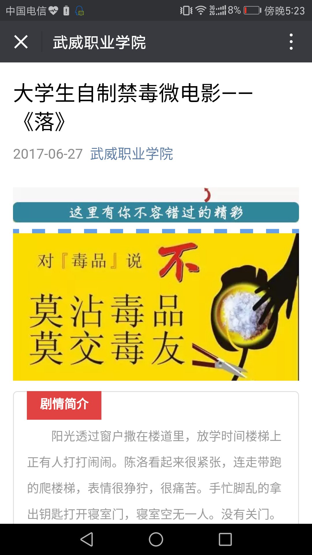 宣傳周期間,利用校園廣播、宣傳欄、新媒體等多種載體以及懸掛宣傳標語、召開“無毒青春,健康生活”主題班會、觀看禁毒影片等多種形式,向廣大師生講述了新型毒品的種類、毒品對個人、對家庭、對社會的危害以及作為當代大學生應如何樹立正確的人生觀和價值觀,潔身自好,抵制誘惑,避免誤入歧途等常識。