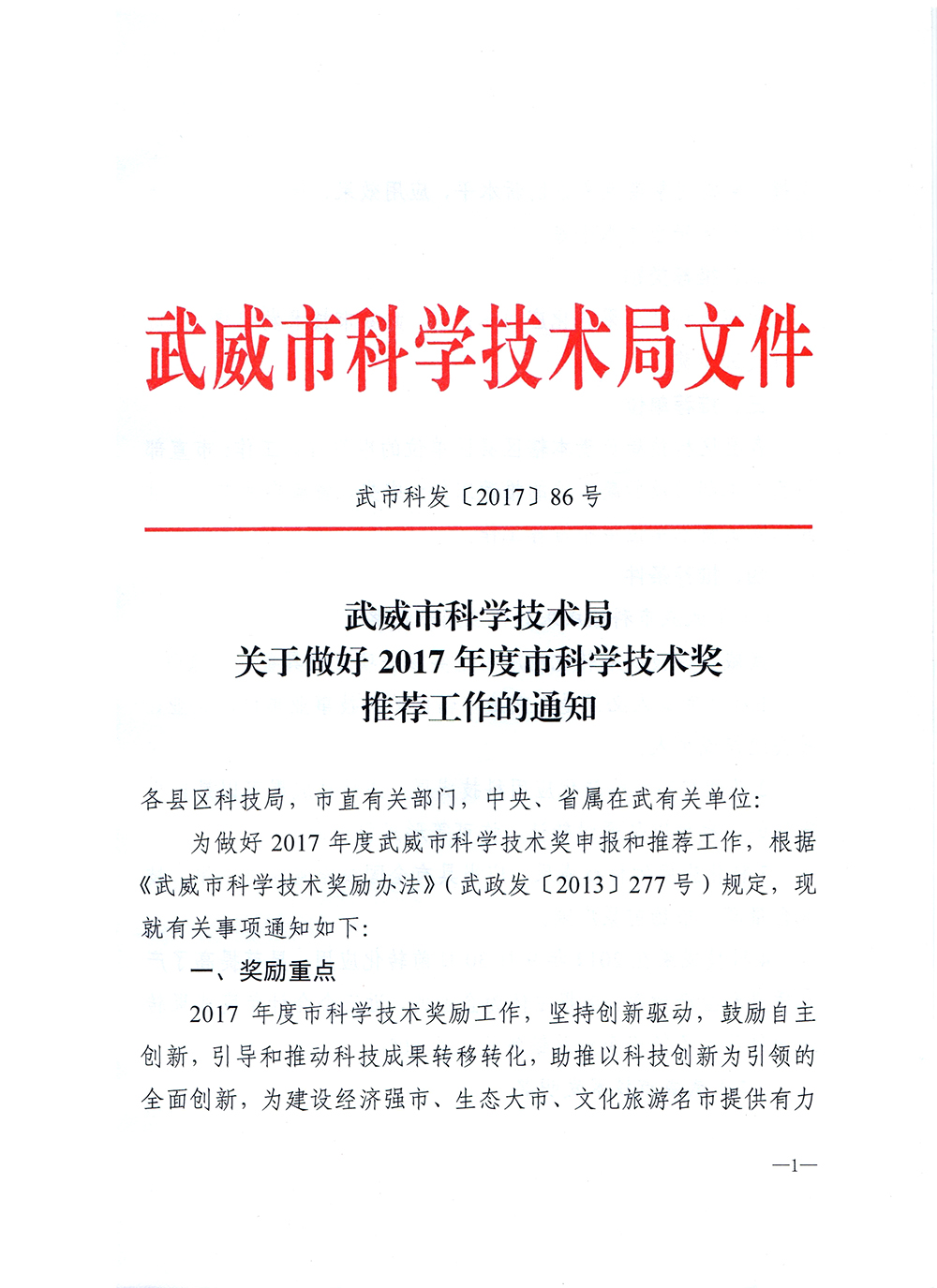 關(guān)于做好2017年度武威市科學(xué)技術(shù)獎推薦工作的通知