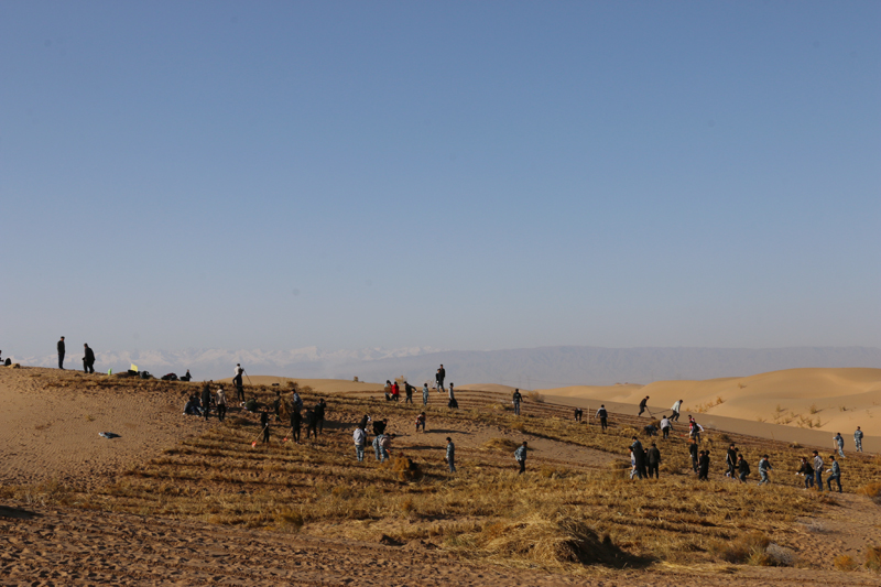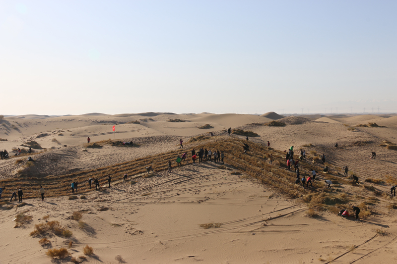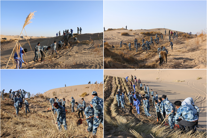 在勞動現(xiàn)場,學(xué)院領(lǐng)導(dǎo)和師生們不畏冬寒,分工協(xié)作,按照標(biāo)準(zhǔn)和要求劃線開溝、蒲草培沙、等距離推進(jìn),現(xiàn)場一片熱火朝天的景象?;氖彽纳车厣砼乱?,整齊的稻草方格逐漸向遠(yuǎn)處的沙丘覆蓋。