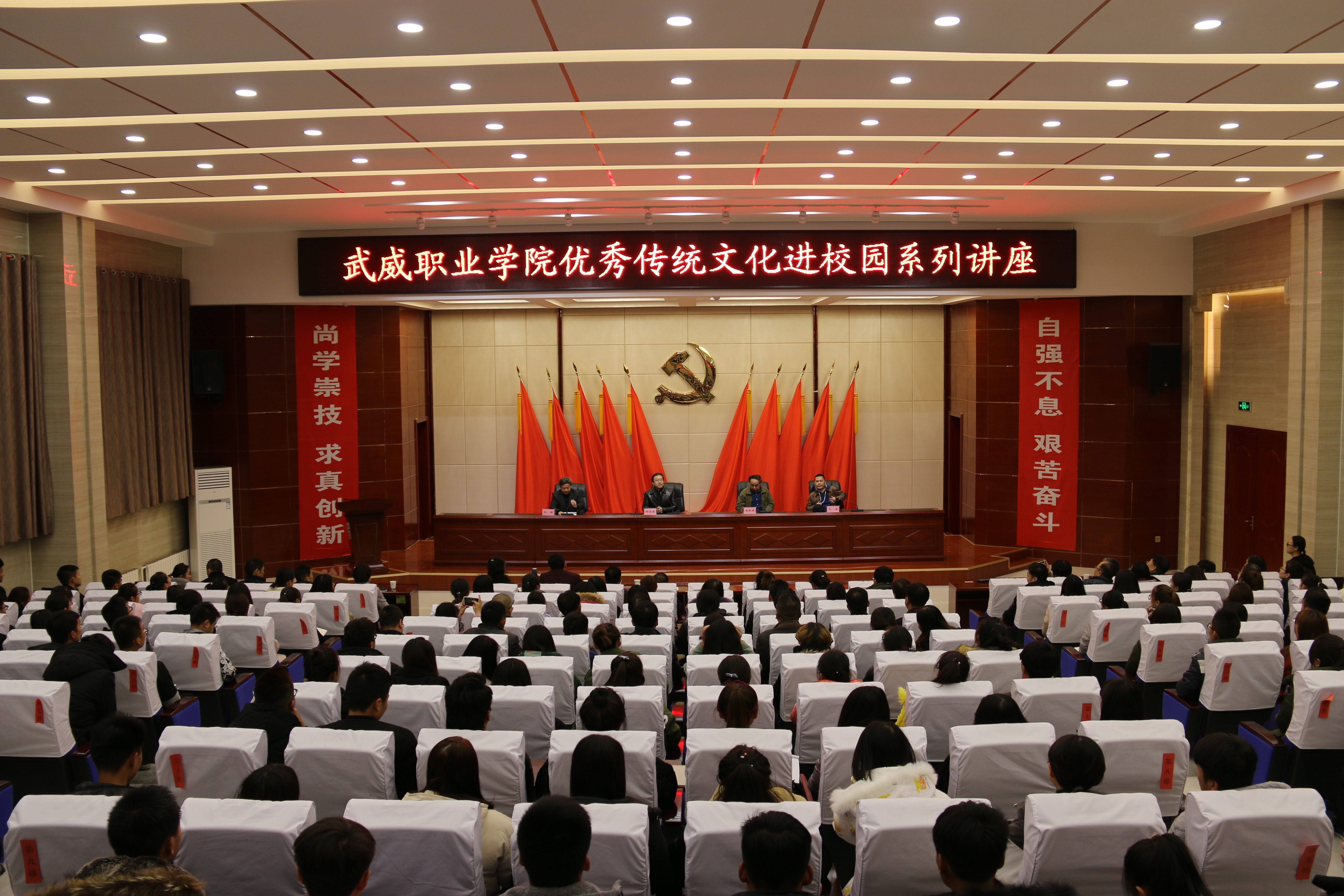 為貫徹落實《甘肅省實施中華優(yōu)秀傳統(tǒng)文化傳承發(fā)展工作方案》,推進優(yōu)質高等職業(yè)院校的建設,加強傳統(tǒng)文化和校園文化相融合,提升校園文化軟實力,11月22日,學院在大學生活動中心菁英廳舉辦優(yōu)秀傳統(tǒng)文化進校園活動?;顒友埩宋鞑恐骷?、西北師范大學傳媒學院院長徐兆壽,甘肅省作家協會主席、甘肅省社科院文化研究所所長馬步升和甘肅省作協副秘書長、70后新銳作家弋舟三位學者以“鳩摩羅什與涼州文化”為主題進行了系列講座。學院黨委副書記趙明主持活動,學院師生共260余人聆聽了講座。
