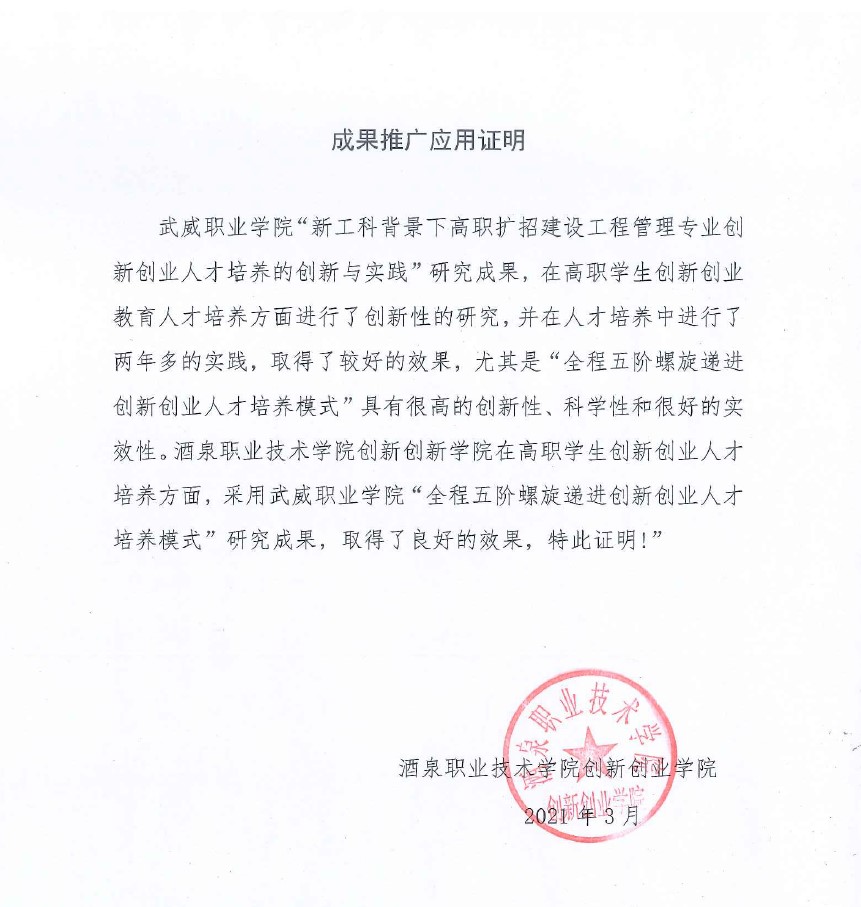 成果推廣應(yīng)用證明(武威職業(yè)學(xué)院建筑工程系)