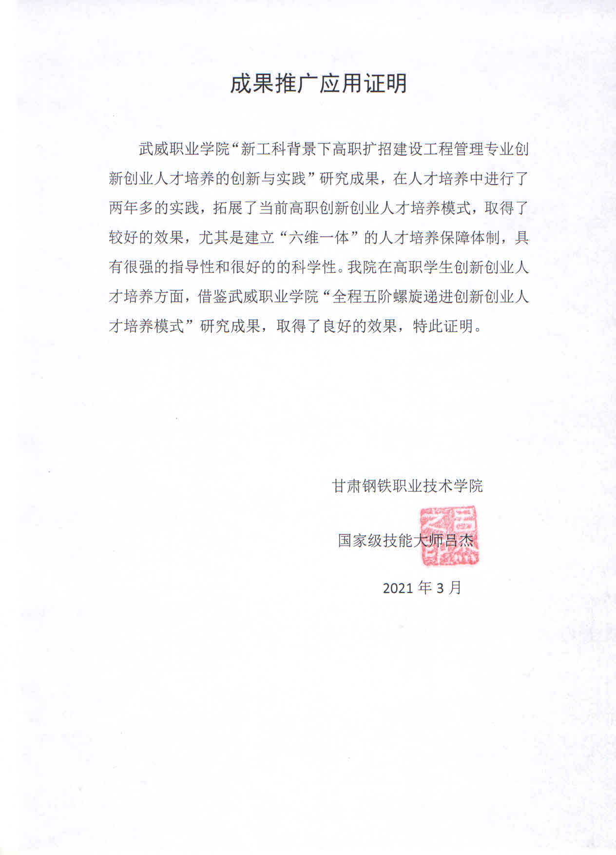成果推廣應(yīng)用證明(甘肅鋼鐵職業(yè)技術(shù)學(xué)院、國家級技能大師呂杰)